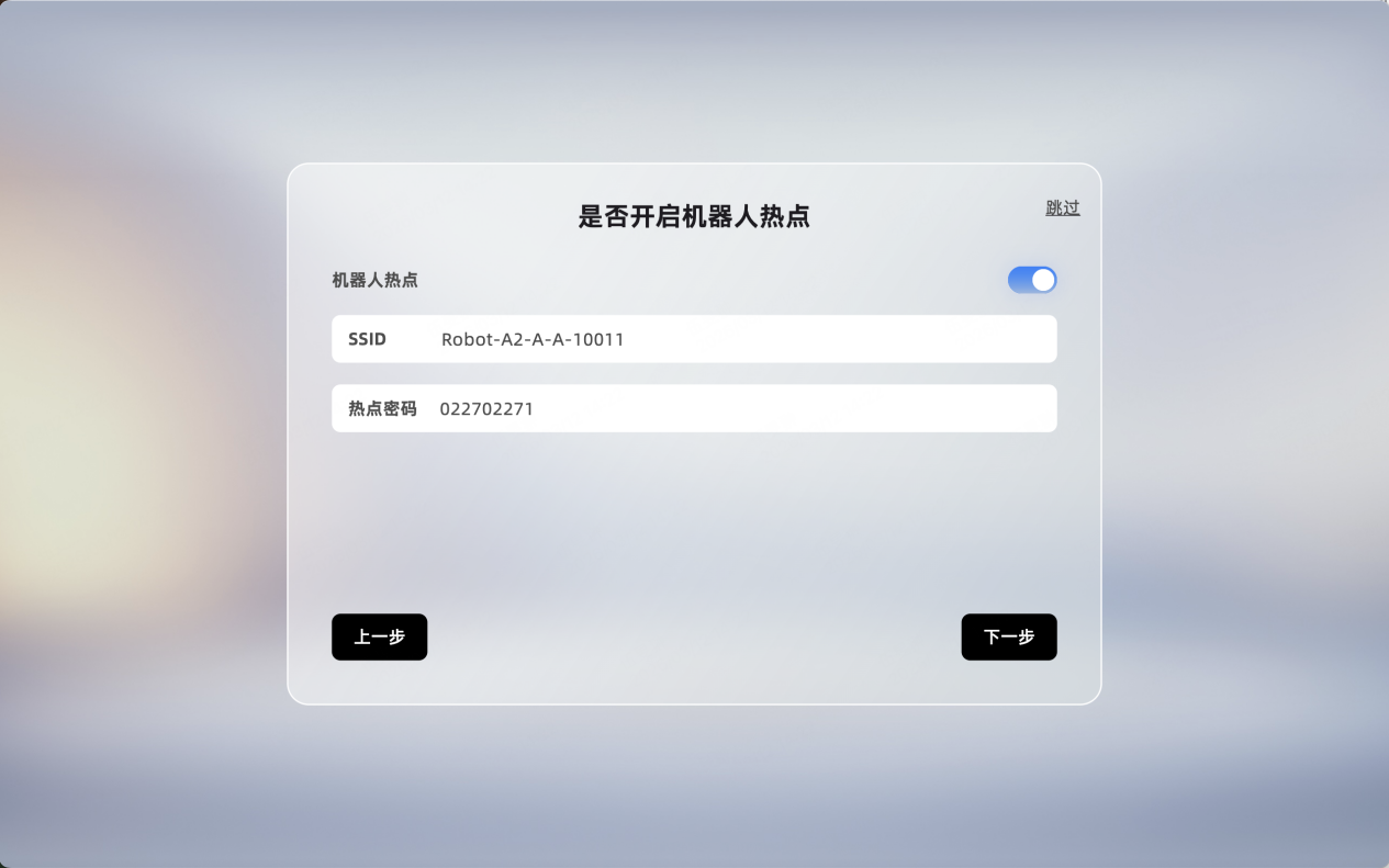 点击遥控器显示的按钮一键连接机器人,随后按照以下步骤设置,并且开启机器人热点。